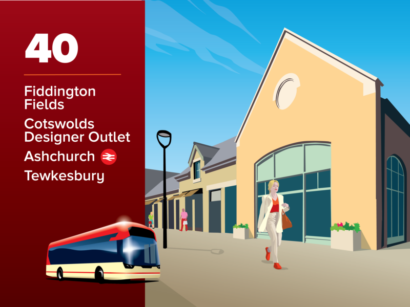 From Tuesday 31st March 2026, service 40 will have a revised route and extend to the new Persimmon Homes Fiddington Fields housing development. Buses will also now run up to every 30 minutes, 7 days a week, providing frequent, reliable links between Fiddington Fields, Cotswolds Designer Outlet, Ashchurch, and Tewkesbury.