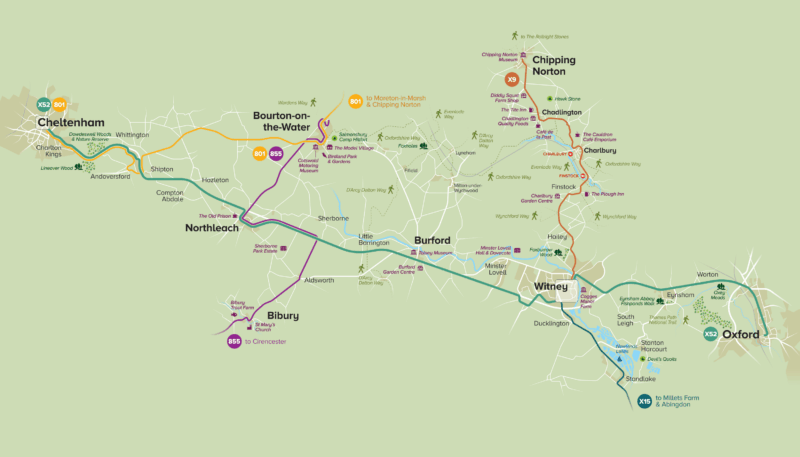 The X52 connects Cheltenham, Andoversford, Northleach, Burford, Witney, Eynsham, Summertown, and Oxford City Centre (Gloucester Green Bus Station).